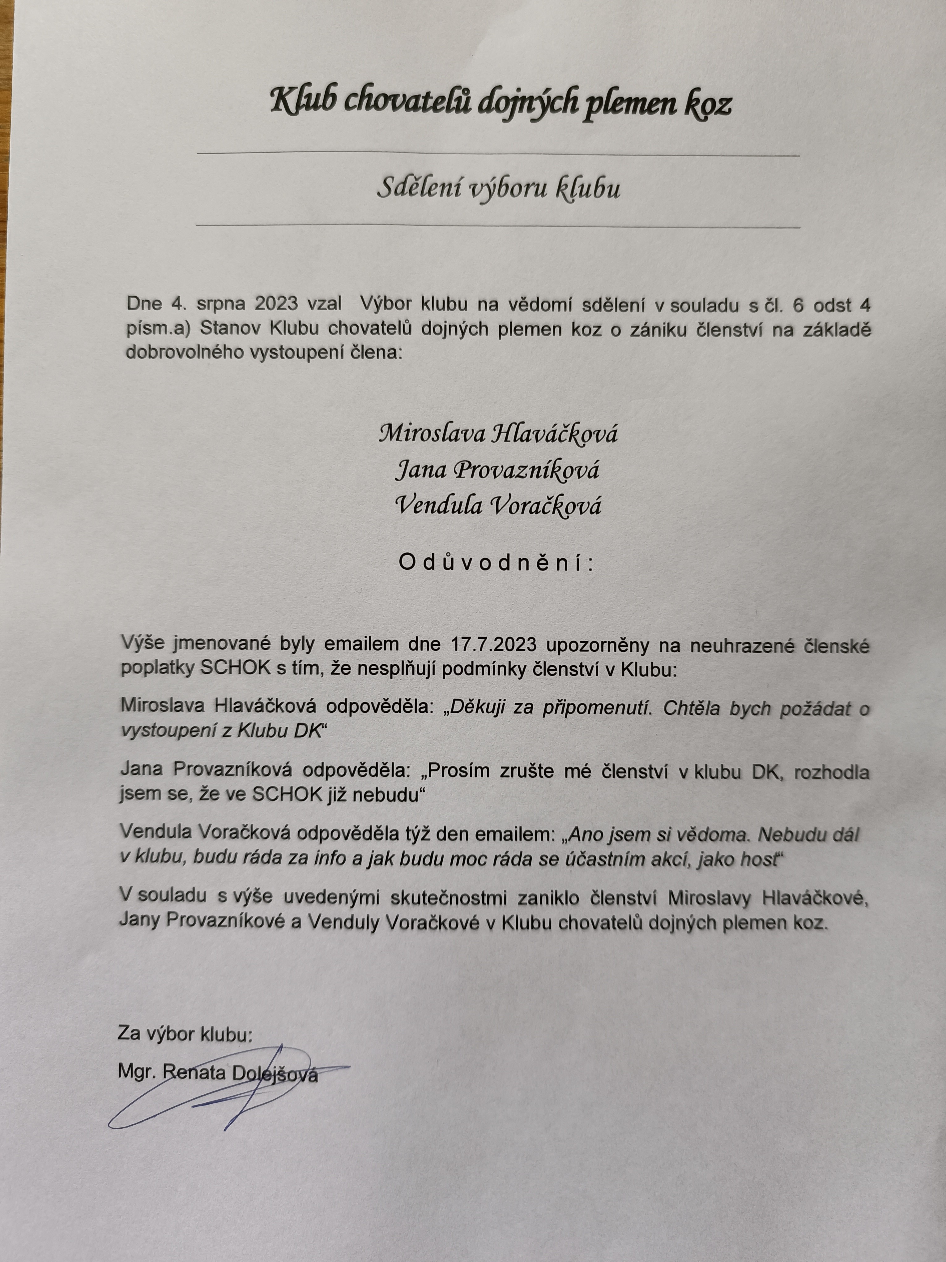 Jednatelka: Mgr. Renata Dolejšová, tel. 608077561, email: renatadolejsova@seznam.cz, - administrace klubu, jednání za klub se SCHOK